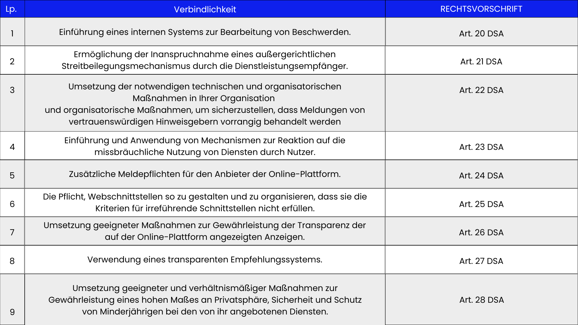 Die oben genannten Pflichten der Anbieter von Online-Plattformen werden im Folgenden kurz zusammengefasst.