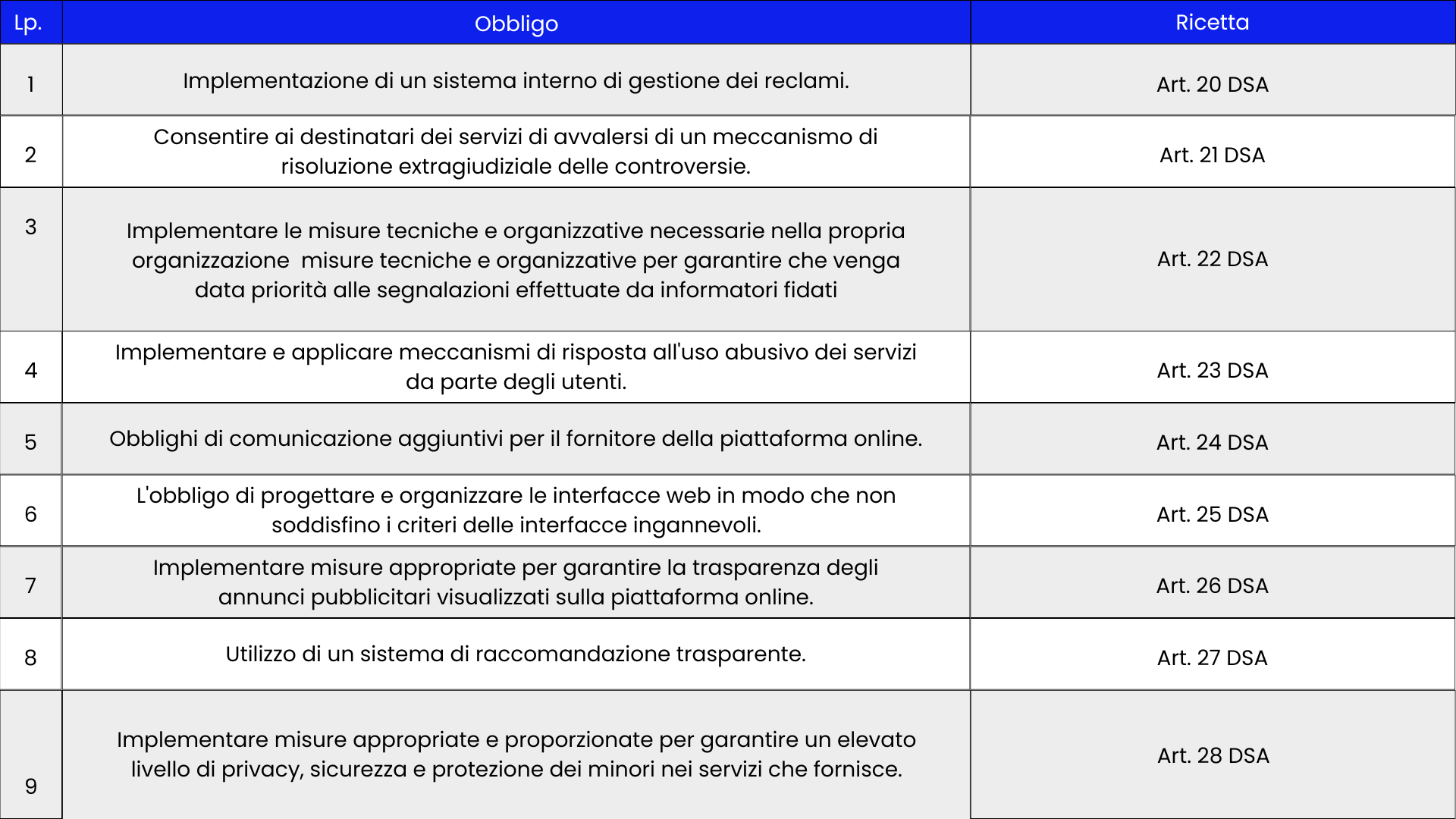 Di seguito si riporta una sintesi generale degli obblighi previsti per i soli fornitori di piattaforme online DSA (Capitolo III Sezione 3 DSA):