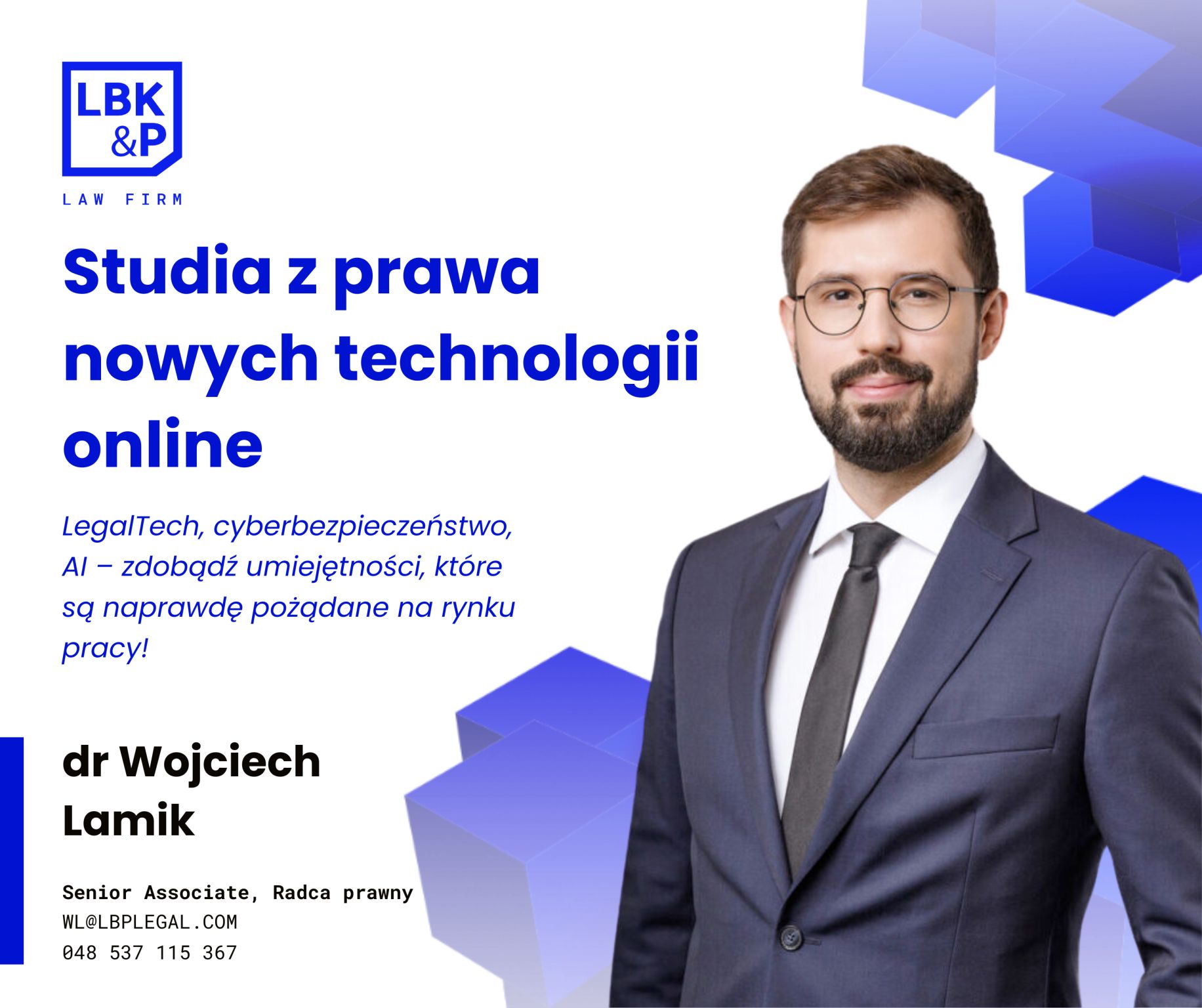 Siamo lieti di annunciare che il nostro nuovo esperto di diritto tecnologico, il Dr. Wojciech Lamik, sarà un docente di questo studio!