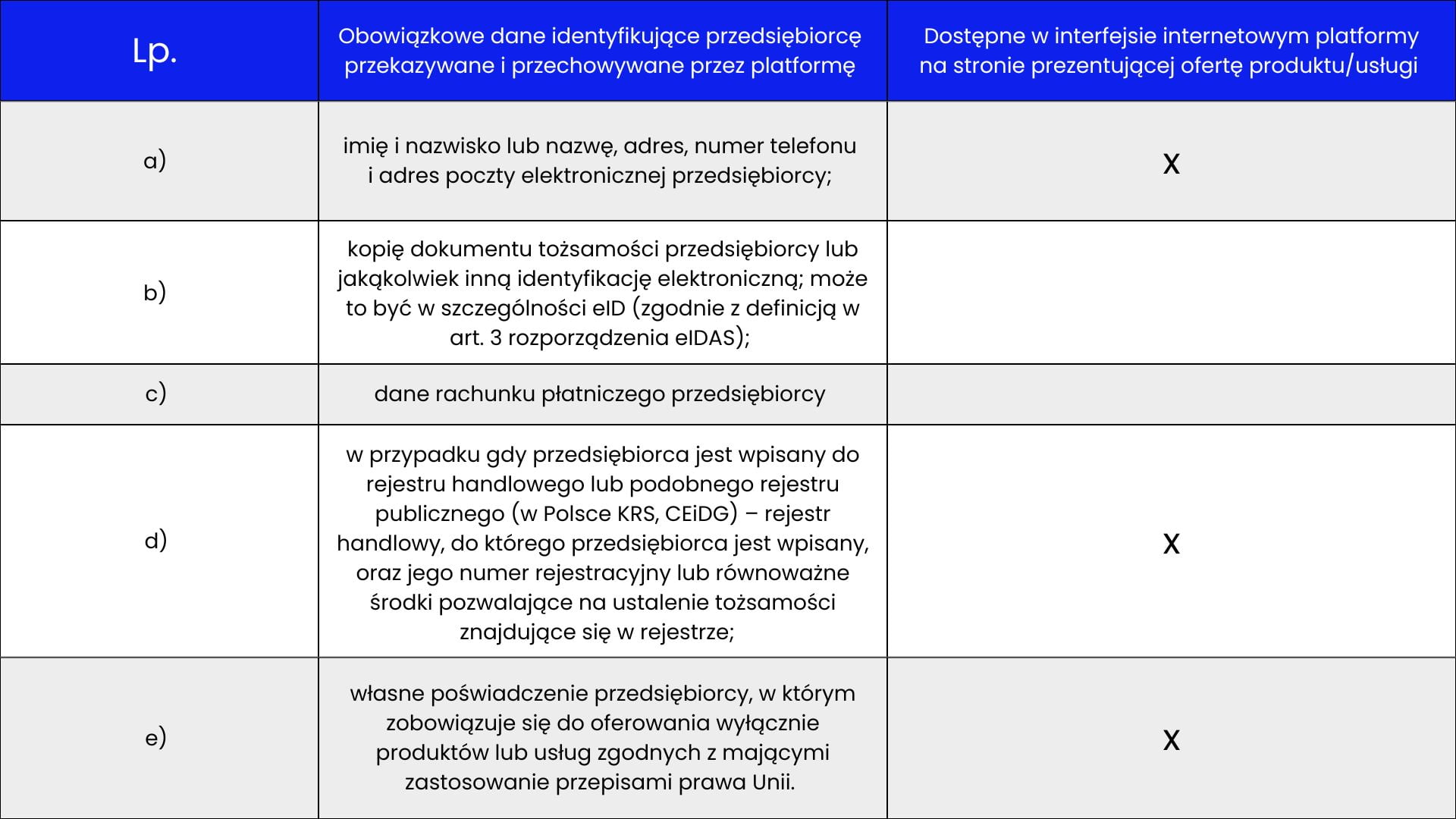 Частина цієї інформації платформа електронної комерції повинна опублікувати хоча б в інтерфейсі інтернет-ресурсу, у місці, де розміщені відомості про товар чи послугу. Платформи електронної комерції повинні докласти зусиль для оцінки, чи є надані підприємцем дані правдивими, повними та актуальними; деталі щодо термінів доставки та перевірки містяться в розділі VIII публікації. Якщо підприємець не надає дані чи роз’яснення, платформа повинна призупинити або відмовити в наданні послуг посередництва з обґрунтуванням. До речі, підприємець, чиє облікове запис було заблоковано або не створено, може безкоштовно подати електронну скаргу і оскаржити рішення, про що більше можна дізнатися в нашій публікації.